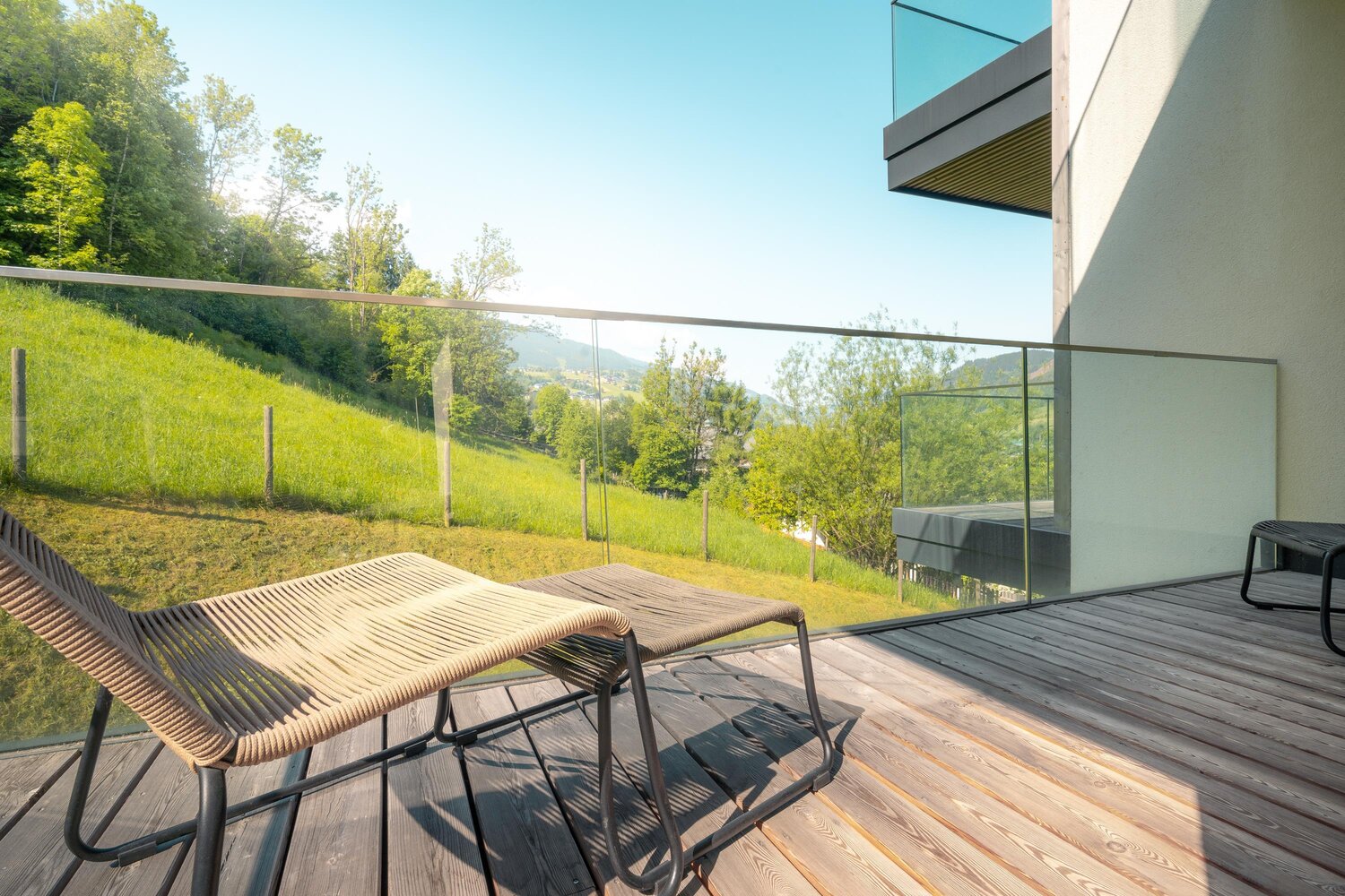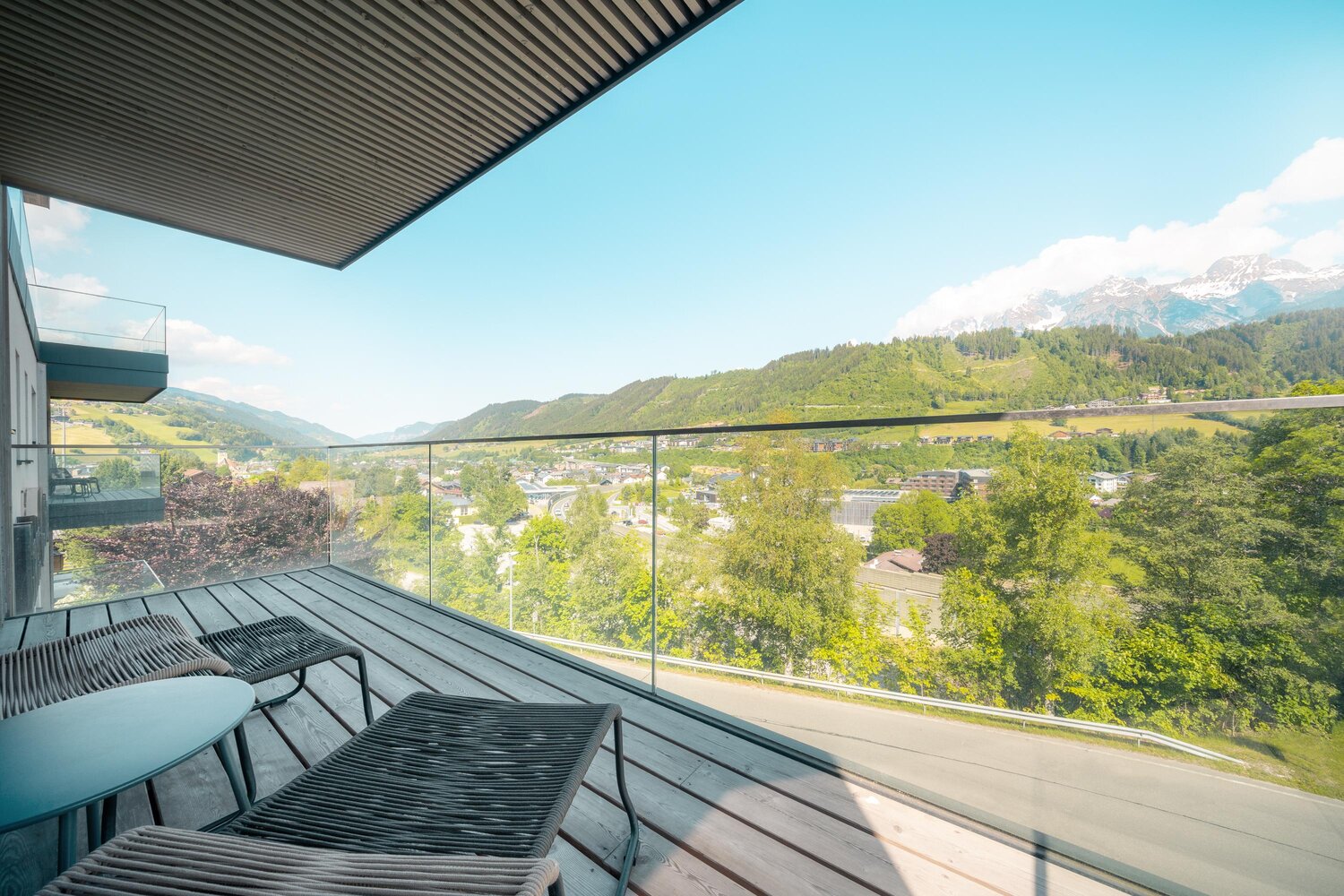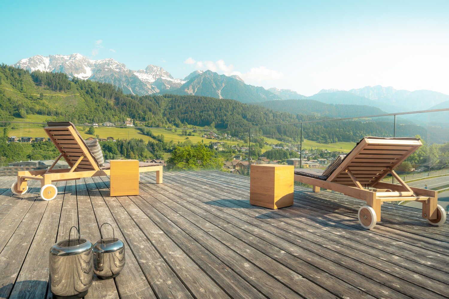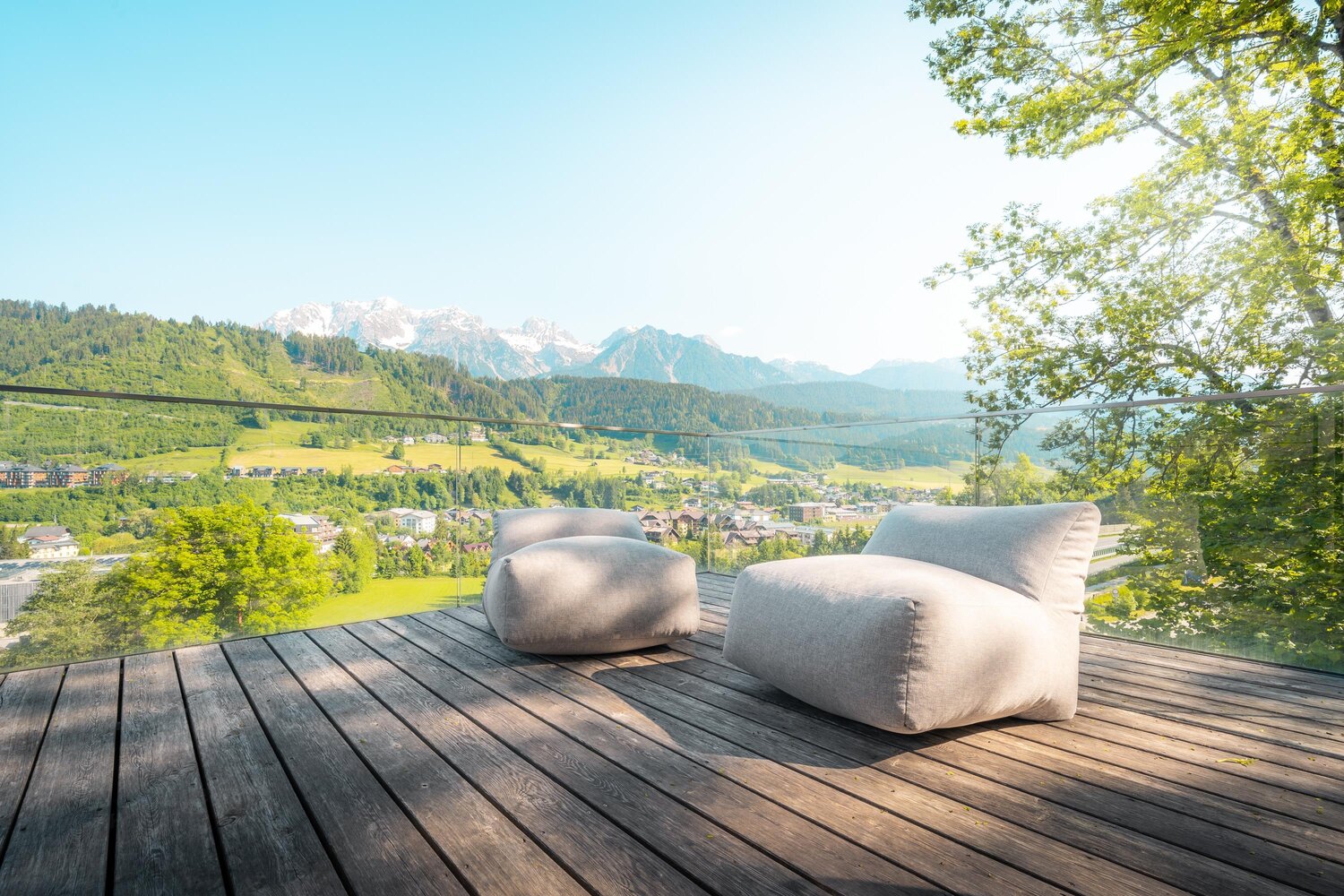 Slightly elevated above Schladming, with a breathtaking panoramic view over the Ennstal valley to the Dachstein massif and the Hochwurzen.